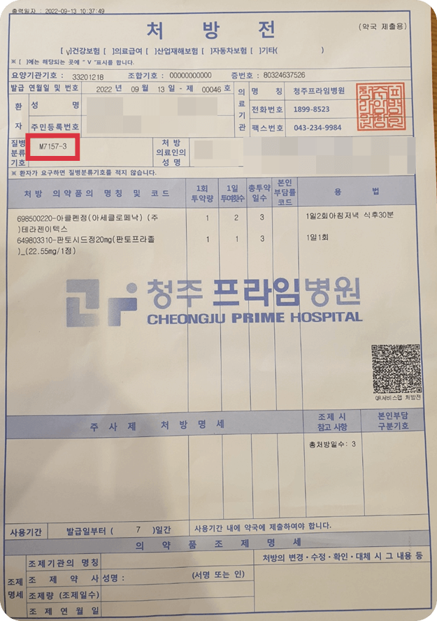 여기서 처방전이 필요한 이유는, 처방전에는 어떠한 병명으로 치료를 받았는지 확인이 가능한 질병분류기호가 표기되기 때문입니다. 처방전은 약국 제출용이기 때문에 사진을 미리 찍어두시길 바랍니다. 사진을 못 찍는다면, 약국에 제출 시 보험 제출용 영수증을 달라고 하시면 됩니다.