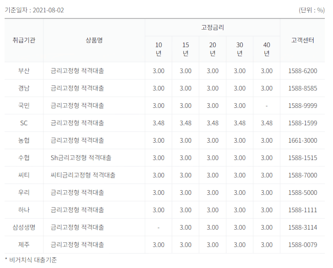 기본형 적격대출의 금리는 고정금리이며 금융기관 및 지점에 따라 상이하니 꼭 확인 후 진행 바랍니다.