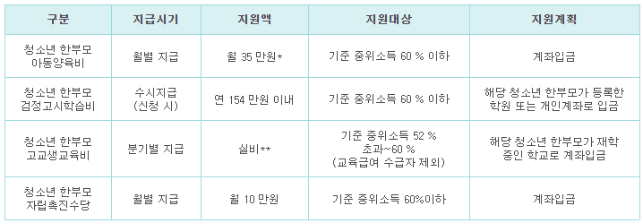 기준을 충족하는 한부모가정이라면 다음과 같이 아동양육비와 청소년 한부모 자립지원을 받게 됩니다.