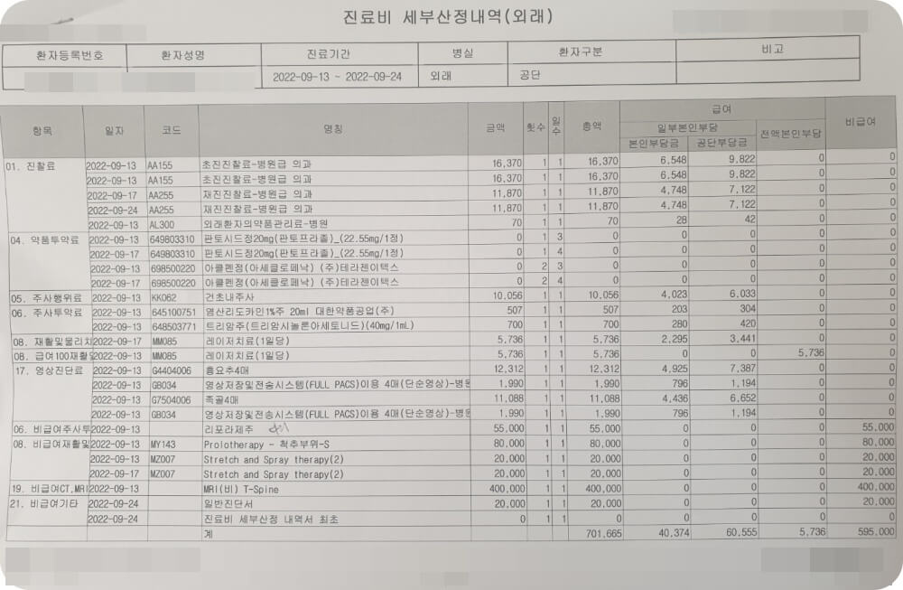 ▶ 병원 진료 내용: 통원치료로 엑스레이, 비급여 주사 및 재활, 비급여 MRI